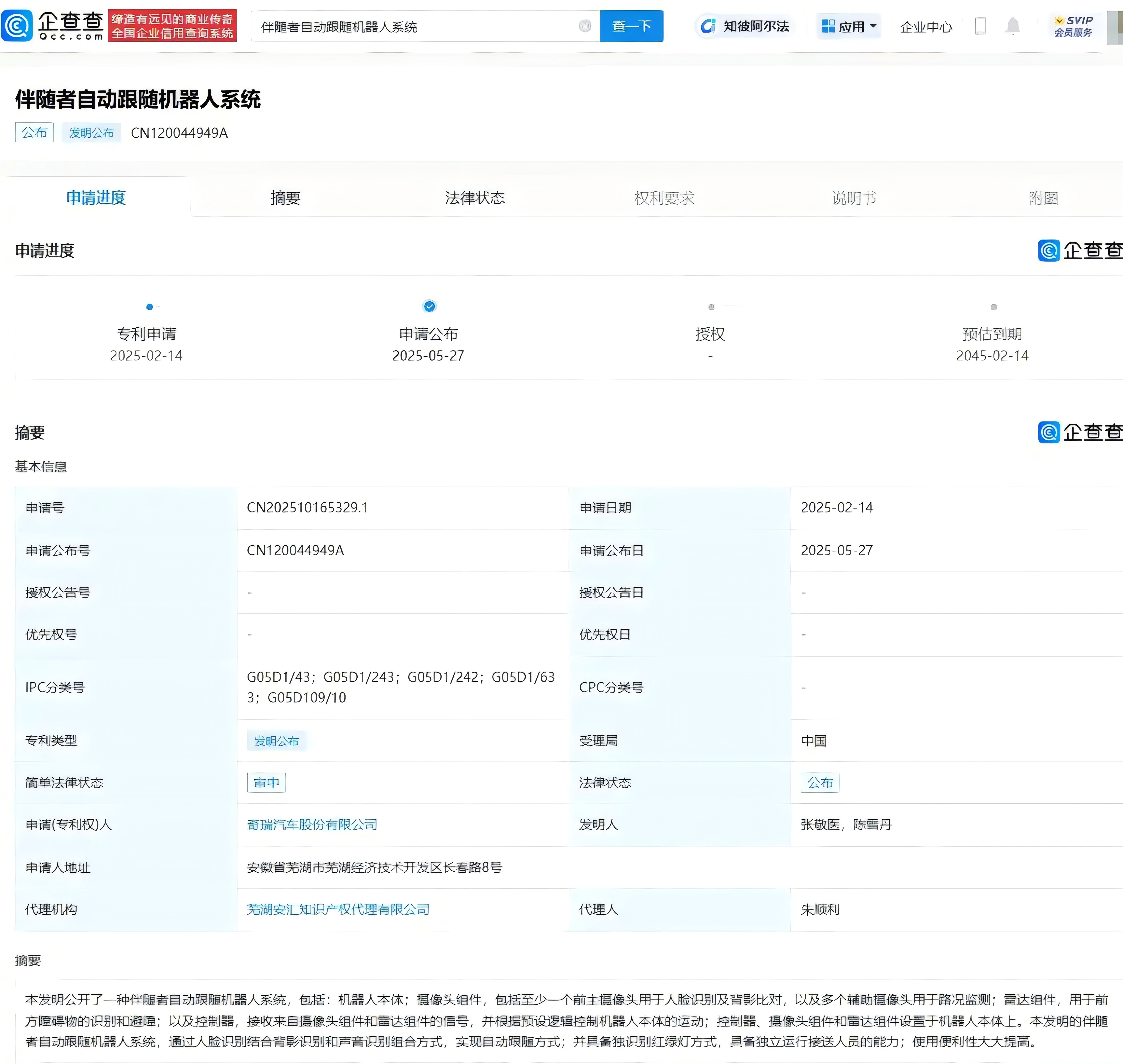近日,奇瑞汽车股份有限公司申请的“伴随者自动跟随机器人系统”专利正式公布。该系统通过人脸识别结合背影识别和声音识别的组合方式,实现了自动跟随功能,并具备独立识别红绿灯的能力,能够独立运行接送人员,极大地提升了使用便利性。
