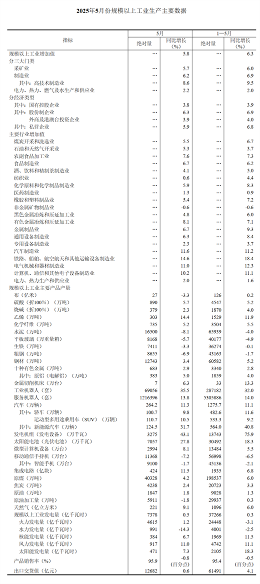 5月份中国规模以上工业生产保持了较好的增长态势,多数行业和产品产量实现同比增长,尤其是新能源汽车、乙烯等重点产品的快速增长,为工业经济的高质量发展提供了有力支撑。