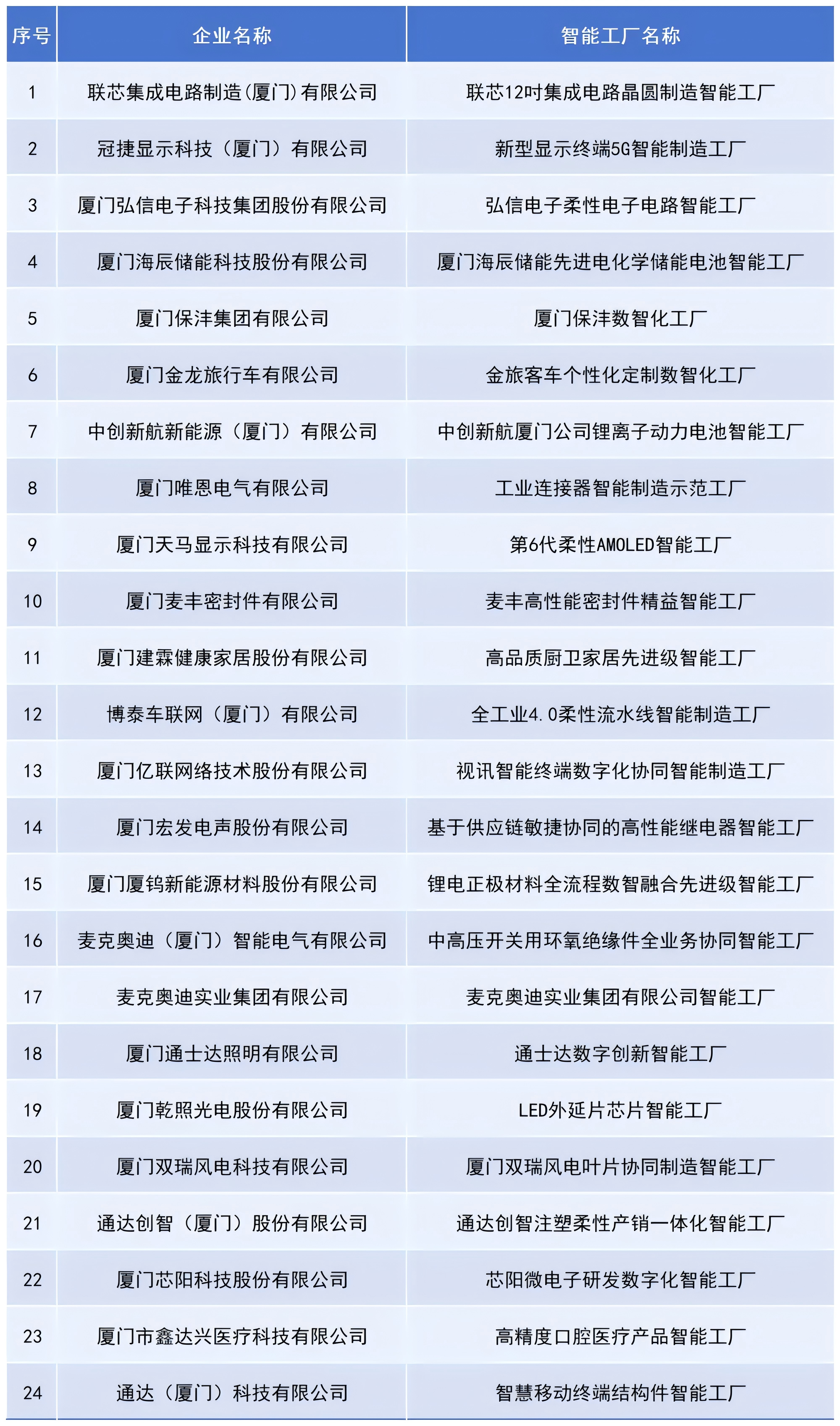 此次入选的项目广泛覆盖了厦门集成电路、新型显示、电子信息新能源、智能制造等多个战略性新兴产业细分领域,其中不乏国家级专精特新“小巨人”、独角兽等企业。具体入选项目包括联芯12英寸集成电路晶圆制造智能工厂、厦门海辰储能先进电化学储能电池智能工厂、弘信电子柔性电子电路智能工厂、金旅客车个性化定制数智化工厂、中创新航厦门公司锂离子动力电池智能工厂、第6代柔性AMOLED智能工厂(天马显示)等。