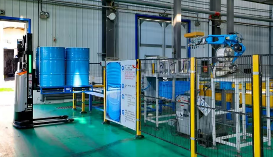 “小车运转,请注意避让......”9月25日,辽宁赛菲化学有限公司(简称辽宁赛菲化学)的立体仓库里,清脆的语音提示划破宁静,一台AGV叉起托盘,上面放着四个蓝色空桶,稳稳驶入水性灌装车间,放在称重滚筒输送线上;旁边三台工业机器人默契接力,一台旋开桶盖,一台注入炔二醇产品,最后一台贴上标签。整个过程无人工干预,却如钟表齿轮般丝滑。